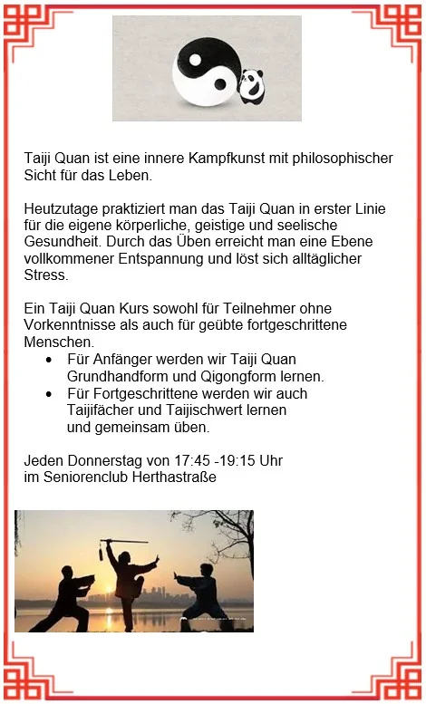 Neuer Taiji Quan Kurs im Seniorenclub Herthastraße